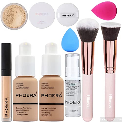 PHOERA Fond de Teint Couvrant Et Face Primer Liquide Couverture Complète Foundation PHOERA Correcteur,PHOERA Poudres,Pinceaux Fond de Teint Et Pinceau Poudre