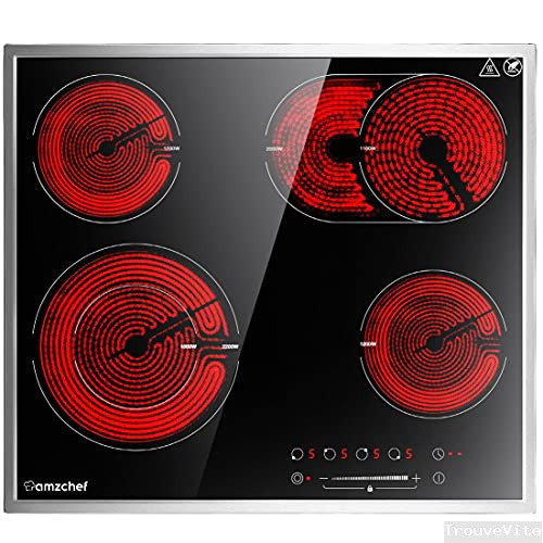 Plaque de cuisson vitroceramique 6600W, AMZCHEF plaque vitroceramique 4 feux avec 9 niveaux de puissance, zone de grillage, double zone, Arrêt automatique,touch slider,convient à toutes les casseroles