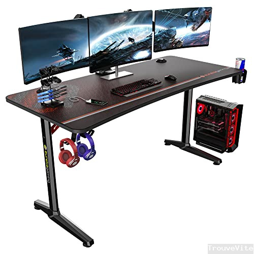 EUREKA ERGONOMIC Bureau Gaming 152 * 70 cm Bureau Gamer P60 Bureau pour Gaming PC Informatique Table avec Tapis de Souris Porte-gobelet Porte-Casque Noir