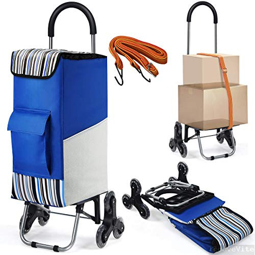 COSTWAY Chariot de Courses Pliable à 6 roulettes, 2-en-1 Poussette de Marché avec Sac de Courses Détachable en Oxford, Cadre en Acier Inoxydable, Sangle Élastique et Poignée, Bleu