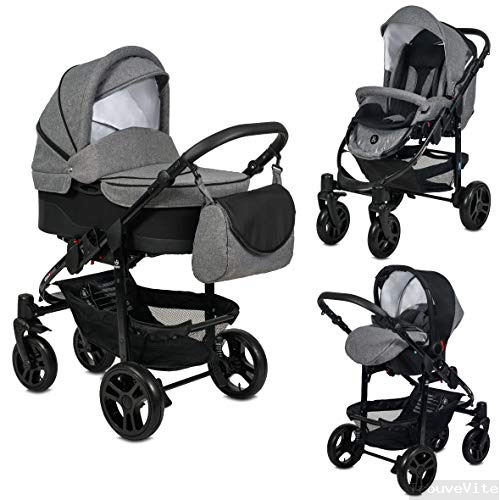 Poussette Combinée Trio 3 en 1 B&W Gris / Noir – Landau, poussette promenade, siège auto Groupe 0 - Livrée avec ses accessoires.