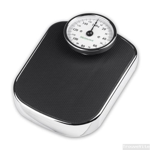 Cette balance nécessite ni pile ni électricité. Il suffit de marcher sur la surface de pesée et la détermination du poids commence. Balance en look rétro avec ajustement manuel par une petite roue.