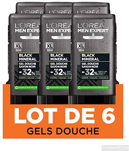 L'Oréal Paris Men Expert Black Mineral Gel Douche Anti-Imperfections Homme 300 ml - Pack de 6