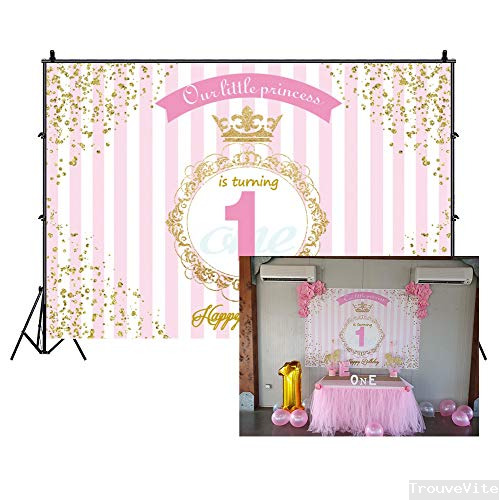 Cassisy 2,2x1,5m Vinyle 1er Anniversaire Toile de Fond Photo Bon Anniversaire Papier Peint Princesse Crown Pink Stripes Fond De Studio Photo bébé Enfant Photographie Props Photobooth