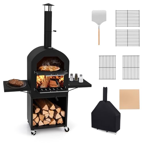 COSTWAY Four à Pizza Extérieur Roulettes, Four à Bois Portable avec Housse de Protection avec Pierre à Pizza Pelle Thermomètre Intégré et Rangement pour Barbecue Camping