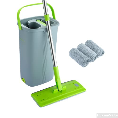 EasyGleam Kit Balai Serpillère & Seau Essoreur - Balai Microfibre Plat avec Manche en INOX, Seau Double Compartiment Humide et à Sec. 4 Serpillères Réutilisables Fournies, Tous Types de Sols