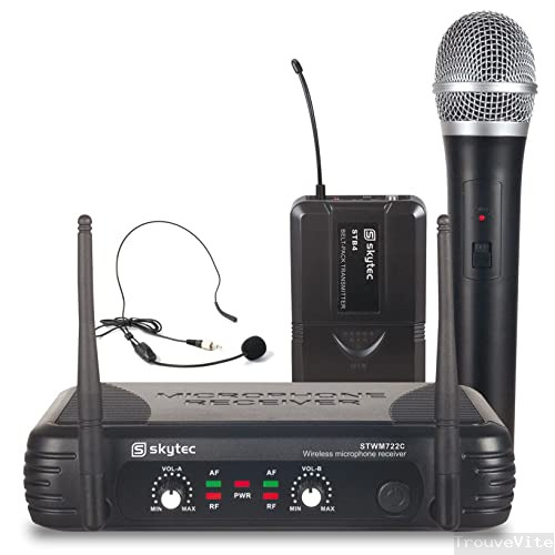 Skytec STWM722C - Microphone sans fil et micro-casque, UHF, 2 canaux, technologie Diversity, livré avec adaptateur et cordon jack 6,3mm, idéal présentations et conférences