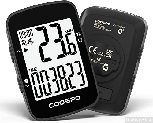 COOSPO BC26 Compteur Velo sans Fil GPS, Bluetooth 5.0 Ordinateur Vélo GPS Kilométrique Odomètre, Écran LCD rétroéclairé de 2, 3 Pouces Compatible avec Strava, Route et VTT