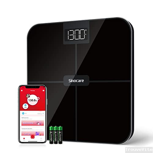 Balance Pèse Personne, sinocare Balance Connectée Bluetooth avec a Application, Pèse-personne Numériques Technologie Step-On, Ultra-Plat, 180kg, Affichage LED