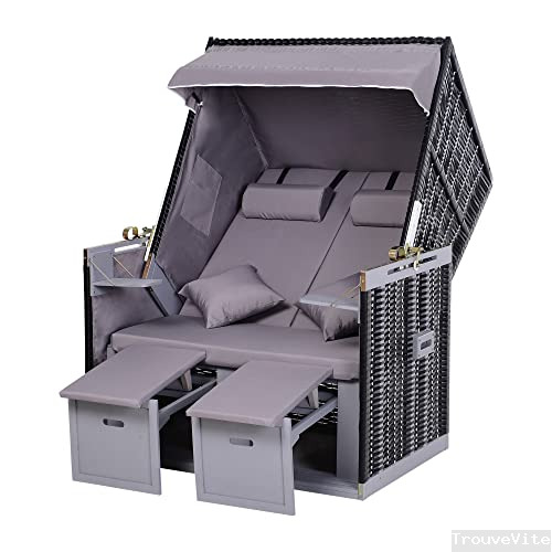 Outsunny Corbeille de Plage 2 Places Pliable - Cabine de Plage inclinable - abri Plage strandkorb - Coussins, Repose-Pieds, tablettes, Pare-Soleil - Bois résine tressée Polyester Gris