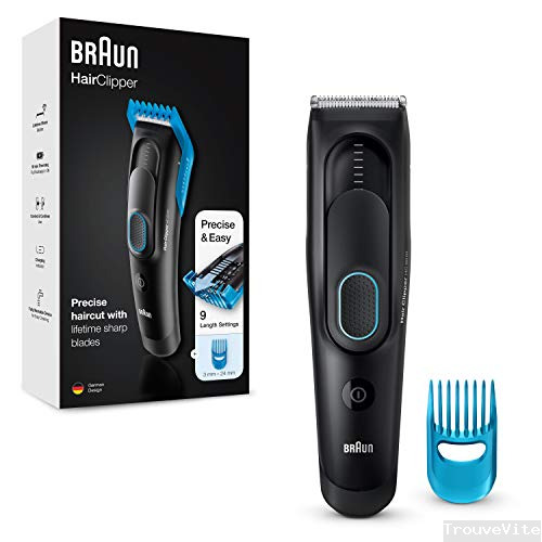 Braun HairClipper Tondeuse Électrique Homme Cheveux Et Barbe, Lames Affûtées Et Inusables Noir/Bleu, Conçues Pour Durer 2 Fois Plus Longtemps, 9 Réglages De Longueur, HC5010