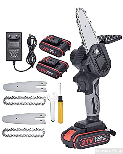WEIWAN Mini Tronconneuse Electrique a Batterie 2000mAh Rechargeable sans Fil avec Chargeur, Mini Tronçonneuse Sans Fil De 4 Pouces, 21V, Puissant 6m/s, 2 batterie, 2 Chaîne, 2 Guidage